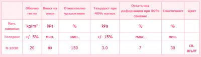 – ИЗХОДНИ МАТЕРИАЛИ – полиетерен полимерполиол, толуилен-диизоцианат, пеностабилизатори, катализатори, оцветители и др.;